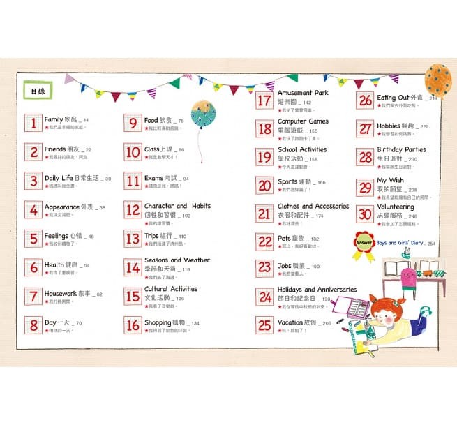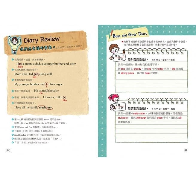 每篇日記後面都有兒童實用的基礎文法和生活經常會使用的句型練習,跟著填空寫句型和學習文法運用知識,孩子就能輕鬆寫出生活英文小日記,每天都超級有樂趣!
